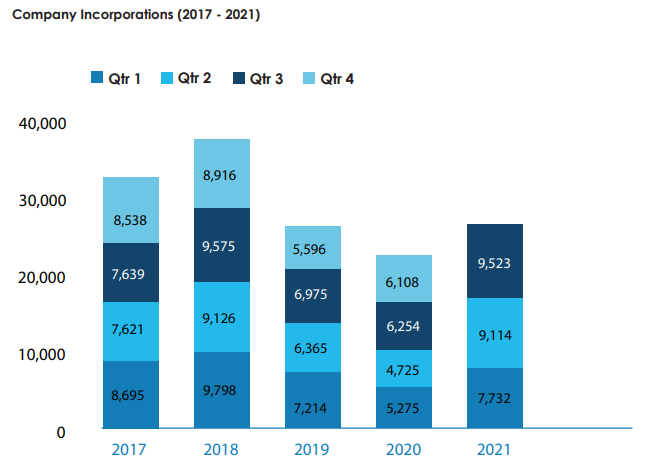 2021年第三季度,BVI公司注冊(cè)數(shù)量9523家,同比增長(zhǎng)52.27%。